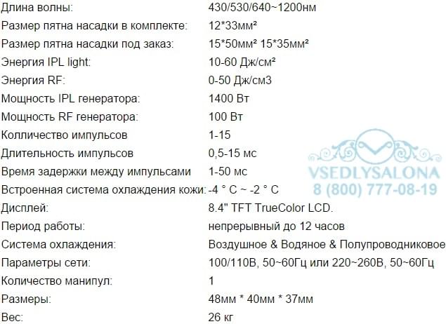 - Одна Элос насадка (IPL + RF , E-light) с размерами пятна 12×33mm²