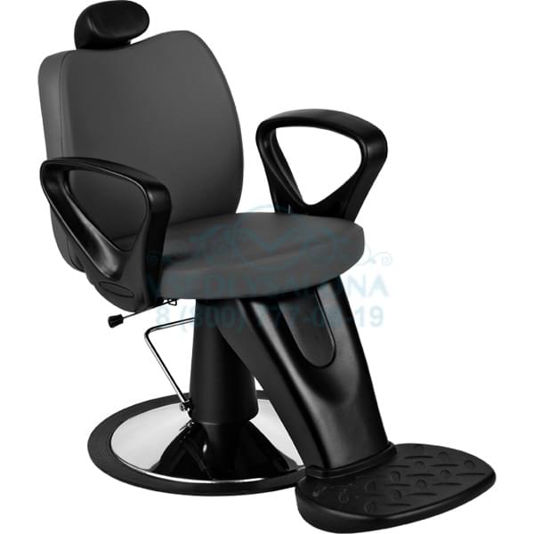 Кресло парикмахерское мужское на диске, выполнено из высококачественного поролона, каркас обтянут искусственной кожей, регулировка высоты гидравлика, с откидывающейся спинкой, выдвижной подголовник, черные пластиковые подлокотники, подножка.