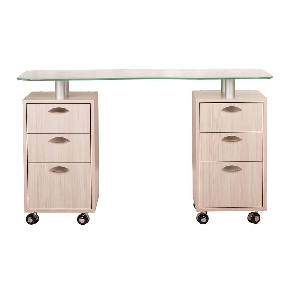 Маникюрный стол 218 S – изящное, крутое изделие, которое чётко показывает рамки парикмахерского дела и гармонично вписывается в общие картины иллюзорного мира профессионала, мастера номер один в салоне. Этот комплект состоит из идеальной, стеклянной столешницы, хромированных креплений, двух тумб, одна и вторая на три ящика, полки, красивых роликовых ножек с хромированной вставкой, стержнем. Стиль неординарный, однако с первого взгляда завораживает каждого посетителя салона. Он поражает своей простотой и универсальностью. Надежное на сто три процента. Фишка от первой индустрии моды. Настоящая изюминка среди конкурентов и аналогичных моделей.