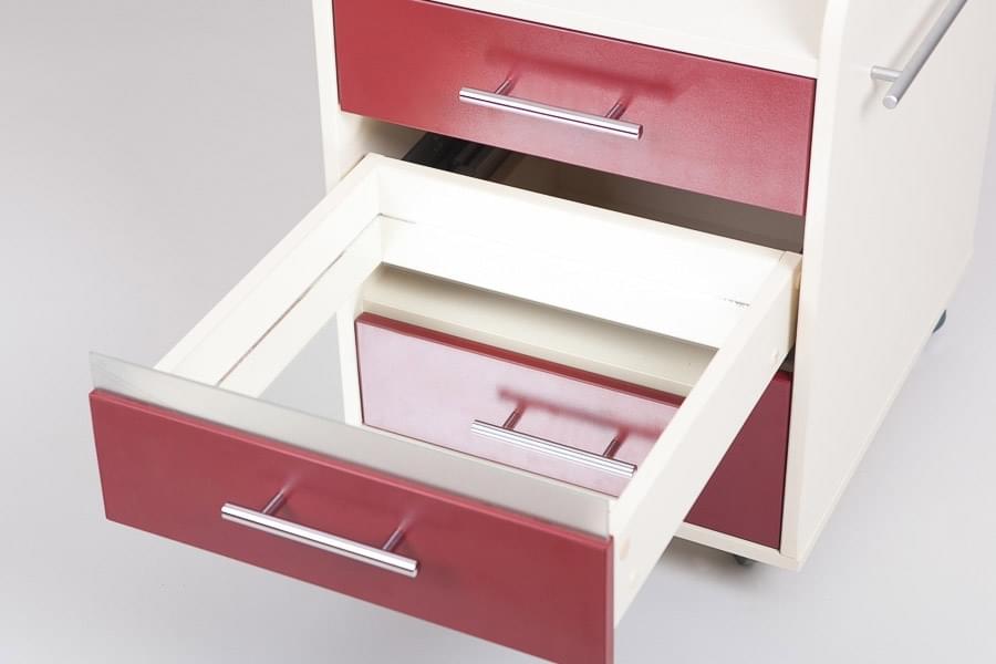 Косметологическая тележка Атика имеет три выдвижных ящика, средний оснащен УФ-модулем с бактерицидной лампой стерилизации инструментов. На правой стенке размещен рейлинг для полотенец. Наверху имеются две открытые полки, где можно разместить косметологическое оборудование и аппаратуру.