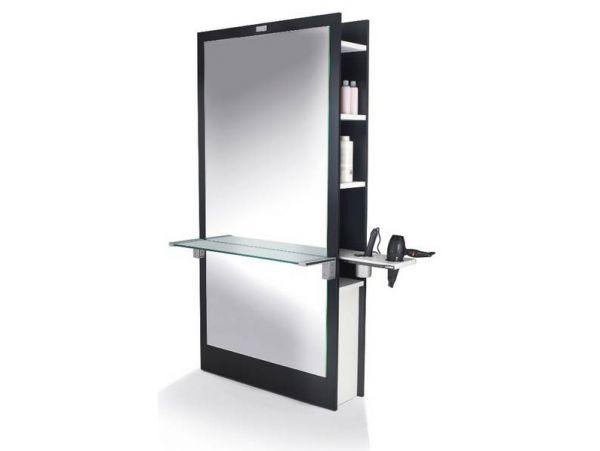 Зеркало парикмахерское одностороннее крепление к стене, с выдвижными ящиками, открытыми секциями и выдвижной держатель для фена и горячих инструментов. Каркас выполнен из ламината черного цвета, стеклянная столешница. Возможен вариант изготовления в ламинате других цветов.
